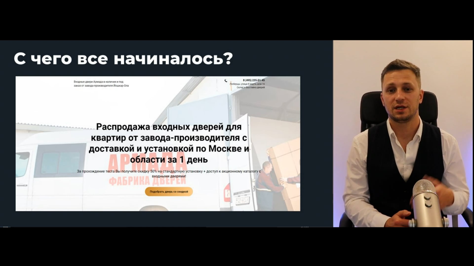 Владимир только вышел из найма в другой дверной компании. Не было сайта, не было трафика, не было команды. Он решил запустить собственный бренд с нуля — со складом в Люберцах, где ранее все менеджеры запрашивали цены. Не стояла задача стать №1 на рынке, но ему очень повезло с маркетологом и всё полетело уже в первый месяц как он себе и не мог представить.